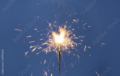 Obraz premium Beautiful sparklers burning on blue background. Party decor