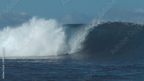 © helivideo, Fototapeta premium Beautiful sparkling ocean wave crashes wildly and sends blue water drops flying.
