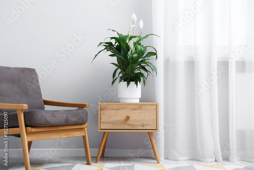 © New Africa, Naklejka premium Beautiful spathiphyllum (peace lily) houseplant with flowers on wooden table at home