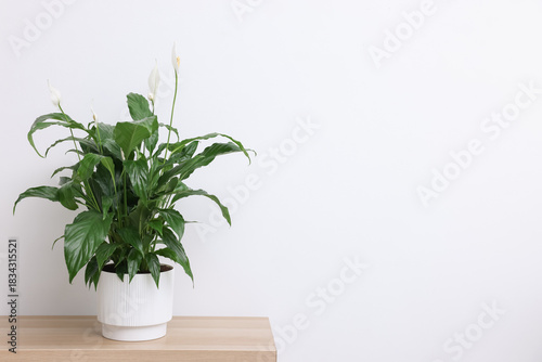 © New Africa, Obraz premium Beautiful spathiphyllum (peace lily) houseplant with flowers on wooden table near white wall. Space for text
