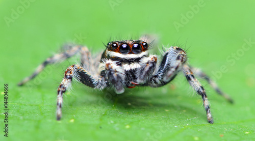 Fototapeta premium Beautiful Spider on green leaf, Jumping Spider in Thailand, Menemerus bivittatus