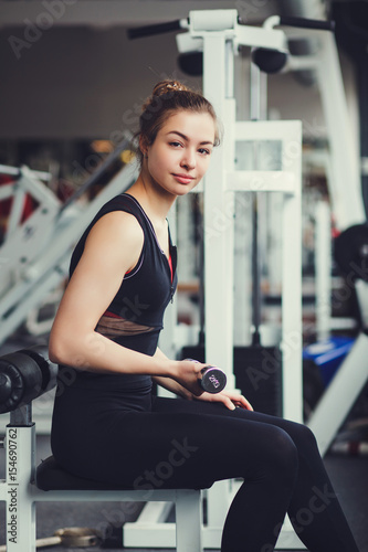 Fototapeta premium Beautiful sports girl picks up dumbbells in the gym