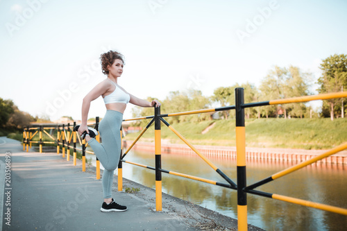 Fototapeta premium Beautiful sporty girl with curly hair is stretching her leg outdoors