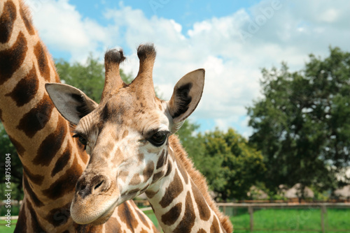 Naklejka premium Beautiful spotted African giraffes in safari park