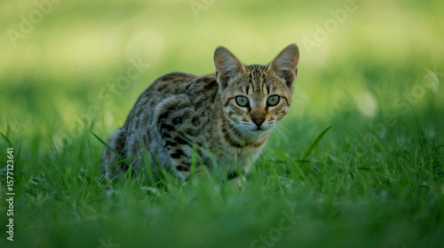 © Abdullah, Obraz premium Beautiful spotted wild cat crouches low in lush green grass looking intently forward