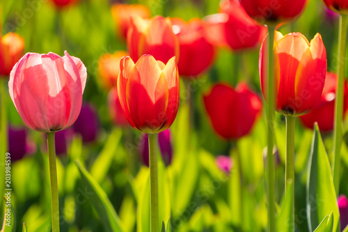 Obraz premium Beautiful spring blooming tulips on a garden bed.