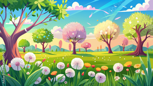 © williamnoah, Fototapeta premium Beautiful spring blurred nature landscape. Background with young juicy green grass with blooming dandelions against the background of flowering trees in the garden.