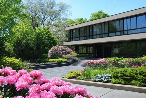 Naklejka premium Beautiful spring day at a modern architectural building surrounded by vibrant blooming flowers and lush greenery in a public garden setting