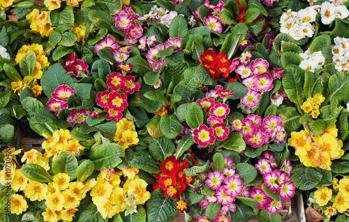 © Melica, Obraz premium Beautiful spring flowers for sale at street market.