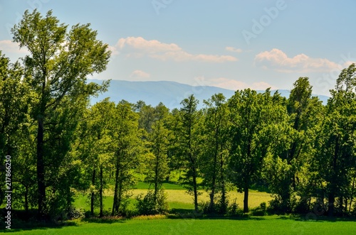 © shadowmoon30, Fototapeta premium Beautiful spring landscape. Green trees and clearing with mountains in the background.