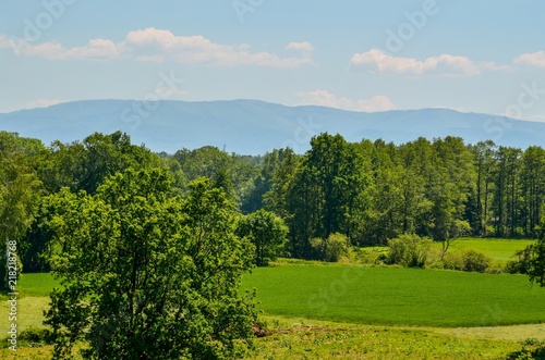 © shadowmoon30, Obraz premium Beautiful spring landscape. Green trees and clearing with mountains in the background.