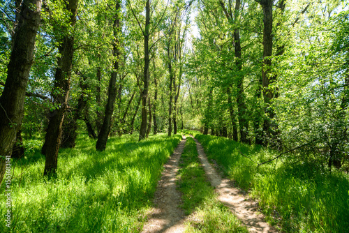 Fototapeta premium Beautiful spring landscape in the forest with a dirt road, bright sunlight through the leaves of trees on the grass
