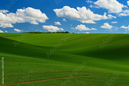 © montypeter, Fototapeta premium Beautiful spring landscape with blue sky, sun and clouds.