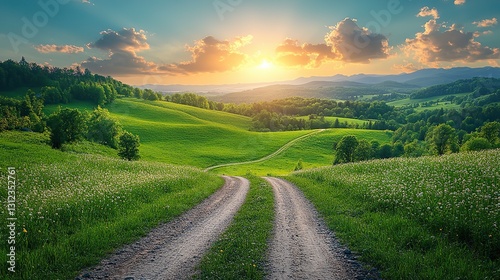 © Claudine, Obraz premium beautiful spring landscape with green meadow road and blue sky