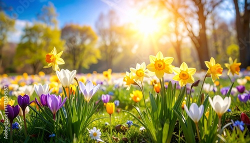 Fototapeta premium Beautiful spring meadow with colorful daffodils and crocuses in warm sunlight.
