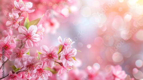 © M, Fototapeta premium Beautiful spring nature scene with pink blooming tree, Blossoming cherry tree branches with copy space, Web banner, Spring time concept