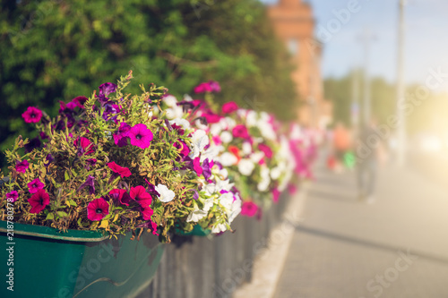 Obraz premium Beautiful spring or summer blossoming flowers in pot on city street