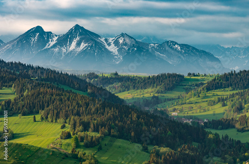© tomeyk, Obraz premium Beautiful spring panorama over Spisz highland to snowy Tatra mountains in the morning, Poland