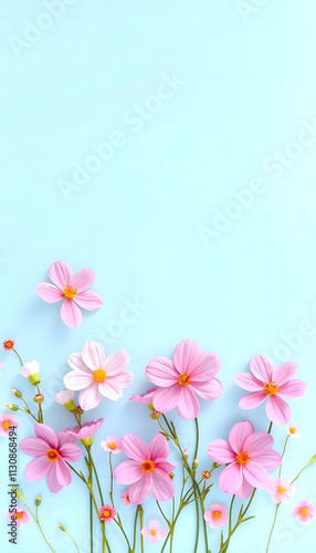 © Go, Naklejka premium Beautiful spring pink flowers on blue pastel table top view. Floral border. Flat lay style, color sketch, with white tones