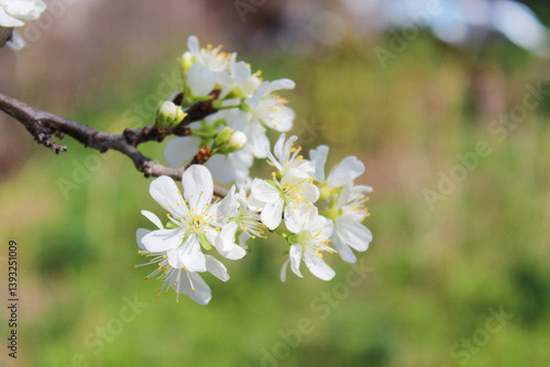 Obraz premium Beautiful spring plum tree blossom. Close-up of white plum tree branches...