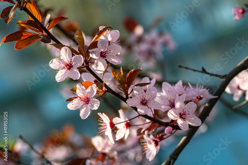 © Serhii, Obraz premium Beautiful spring sakura branches with flowers on a cloudy day macro photography