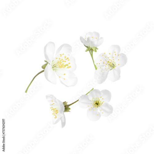Obraz premium Beautiful spring tree blossoms falling on white background