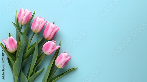 Naklejka premium Beautiful spring tulips and space for text on light blue background....