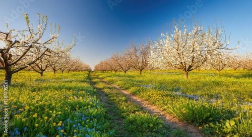 © Tati, Fototapeta premium Beautiful springtime orchard with blossoming trees and vibrant wildflowers under clear blue sky