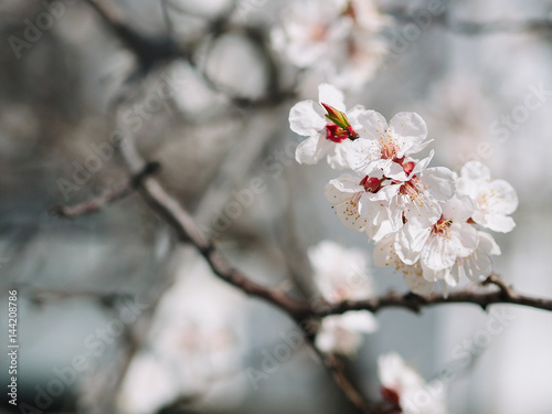 © koralstory, Obraz premium Beautiful springtime. Watercolor background. Blooming tree branches with white flowers. White sharp and defocused flowers blooming tree.