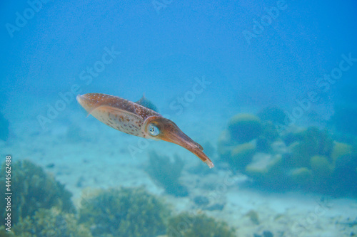 Fototapeta premium Beautiful squid swimming in the blue waters of the Caribbean sea of Curacao...
