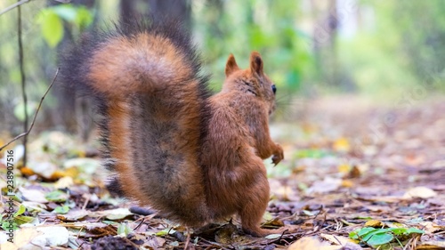Fototapeta premium Beautiful Squirrel close up with fluffy tail in forest, Tomsk