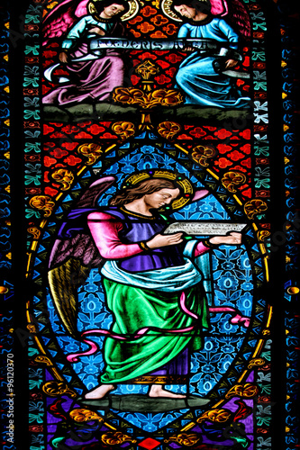 © Stan Tiberiu, Fototapeta premium Beautiful stained glass window from Santa Maria de Montserrat Abbey (Catalonia, Spain).