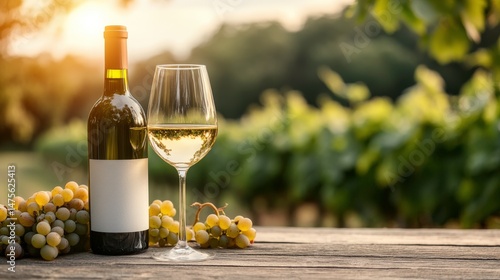 Fototapeta premium Beautiful still life with a wine bottle and glass on a wooden table surrounded by fresh grapes under a sunset glow in a vineyard setting