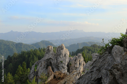 © Nustian Degraf, Fototapeta premium beautiful stone on hill with forest view, landscape nature background image