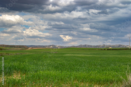 © Maria, Fototapeta premium Beautiful storm landscape surroundings of Zaragoza rain rainbow and horizon hills