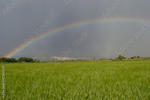 © Maria, Naklejka premium Beautiful storm landscape surroundings of Zaragoza rain rainbow and horizon hills