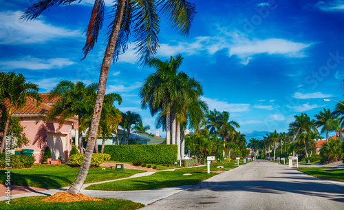 Fototapeta premium Beautiful street of Floirda with palms and homes