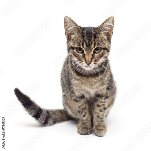 © Ian 2010, Obraz premium Beautiful striped kitten of gray isolated on white background. The cat is carefully posing for the camera. Place for text. Tiger color