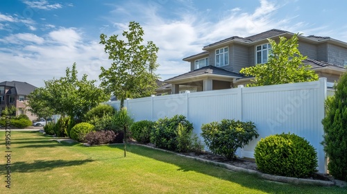 © Banstanks, Fototapeta premium Beautiful suburban house surrounded by lush greenery and a white fence under a clear blue sky