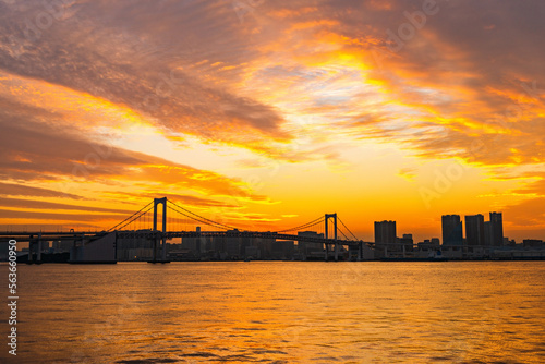 Fototapeta premium beautiful sultry sunset landscape with silhouette of famous Rainbow Bridge Tokyo, Japan, travel background