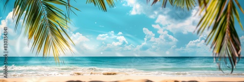 © DWN Media, Fototapeta premium Beautiful summer background with blurred sandy beach and palm tree leaves on blue sky banner, panoramic banner with copy space for design text