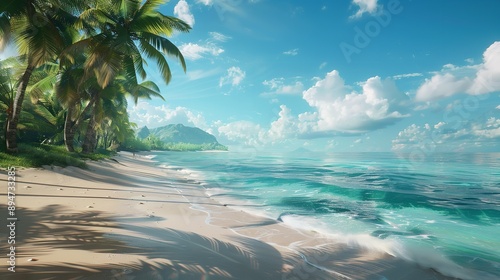 © Devian Art, Fototapeta premium Beautiful summer background with palm leaves and sandy sea beach under a blue sky. Copy space.