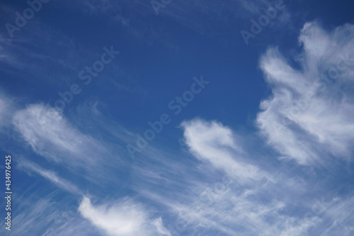 Obraz premium Beautiful summer blue sky with white feather clouds, natural background for...