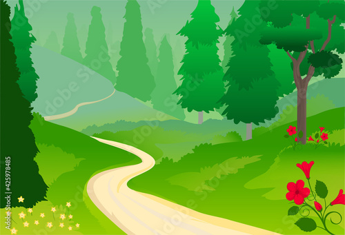© Carrot, Fototapeta premium Beautiful summer forest background with pine trees and flowers