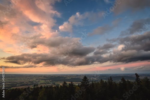 Fototapeta premium Beautiful summer landscape. Colorful sky and clouds in the mountain scenery.