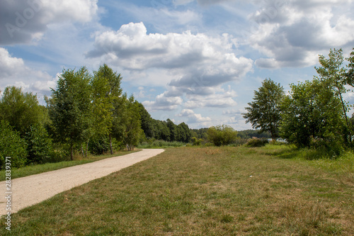 © Olena, Naklejka premium Beautiful summer landscape of a country road in a green meadow surrounded by trees and a lake.