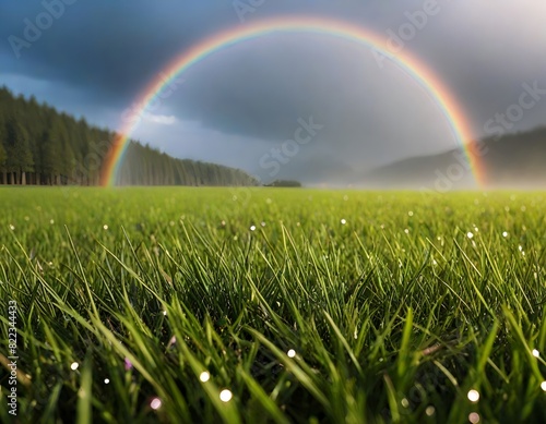 © Thossaphon, Fototapeta premium Beautiful summer landscape with a rainbow arcing across a bright blue sky over a green field Generative AI