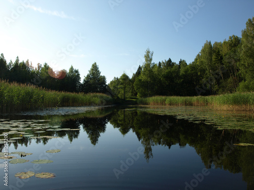 Fototapeta premium beautiful summer landscape with calm lake, reflections of different trees, blue sky, calm water, Latvia