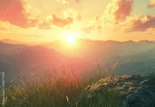© Dzikrul Husnani, Fototapeta premium Beautiful summer landscape with green grass on the mountain hill and a beautiful sunset sky over the mountains in the background, with copy space for text. high resolution.