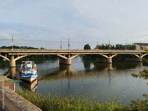Fototapeta premium beautiful summer landscape with passenger boat docking on the river, concrete pedestrian bridge